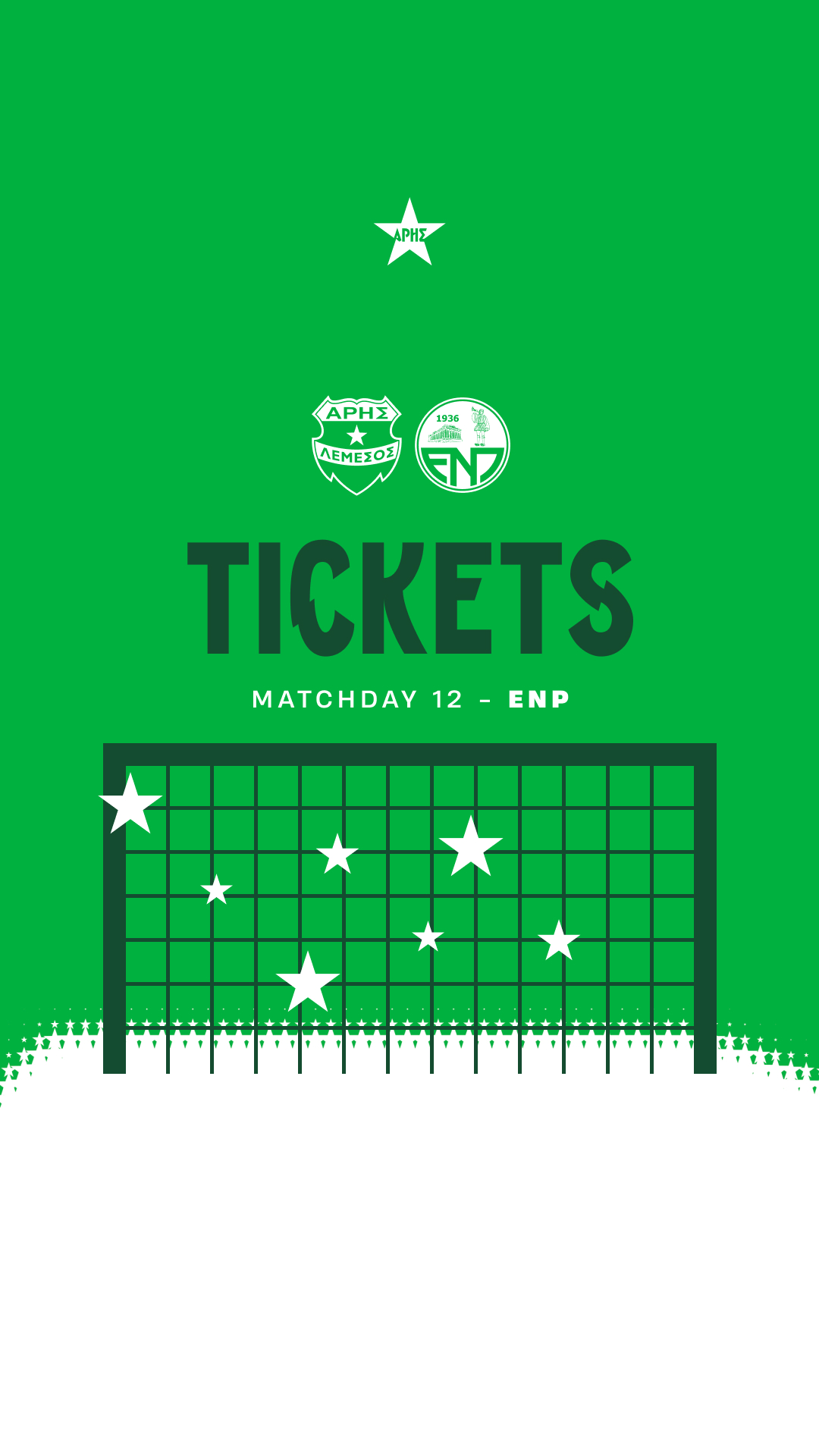 Tickets are available online through our official website: www.arisfc.com. Tickets can also be purchased at our club offices, located at 56 Amathountos Avenue, in Agios Tychonas (opposite the POSEIDONIA hotel) on Tuesday to Friday from 09:30 to 17:30, and on Saturday from 10:00 to 13:00.