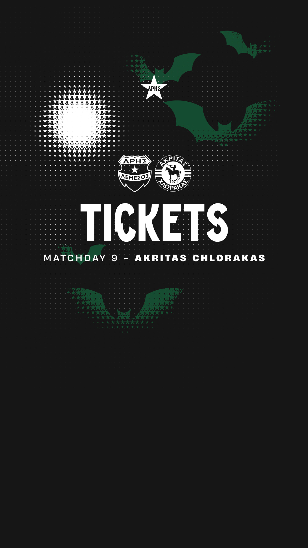 Tickets are available online through our official website: www.arisfc.com. Tickets can also be purchased at our club offices, located at 56 Amathountos Avenue, in Agios Tychonas (opposite the POSEIDONIA hotel) on Wednesday and Thursday from 09:30 to 17:30, and on Friday from 09:30 to 13:00.