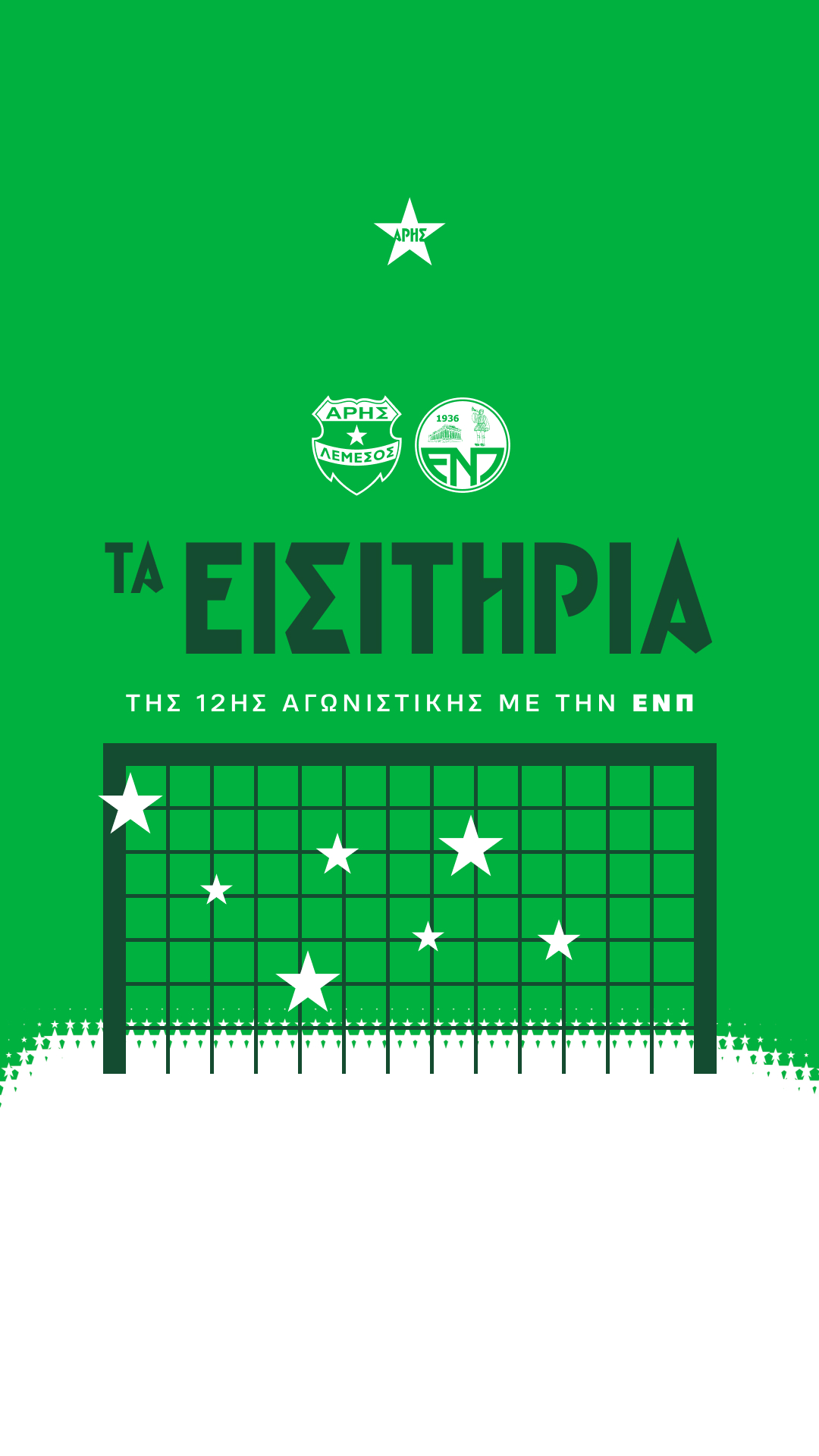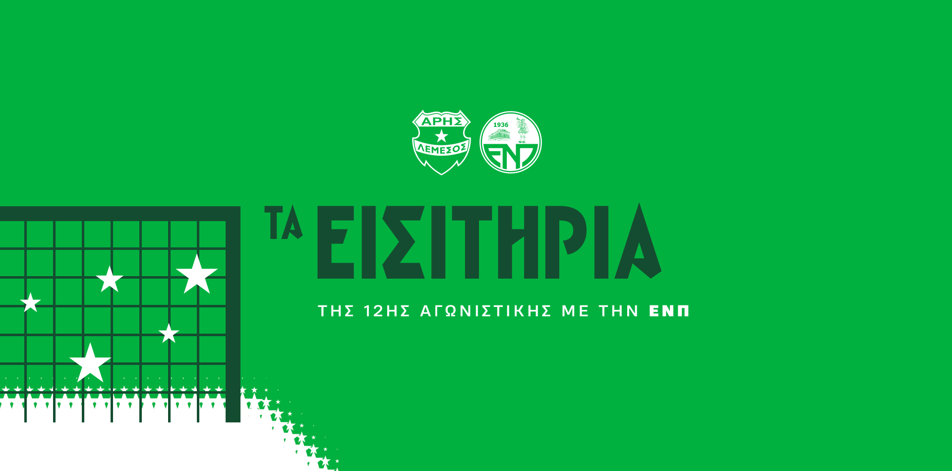 Τα εισιτήρια διατίθενται διαδικτυακά από την επίσημη ιστοσελίδα μας www.arisfc.com. Επίσης, από τα γραφεία της ομάδας μας στην Λεωφόρο Αμαθούντος 56, στον Άγιο Τύχωνα (απέναντι από το ξενοδοχείο POSEIDONIA), Τρίτη με Παρασκευή από τις 09:30 έως τις 17:30 και το Σάββατο, 10:00 με 13:00.