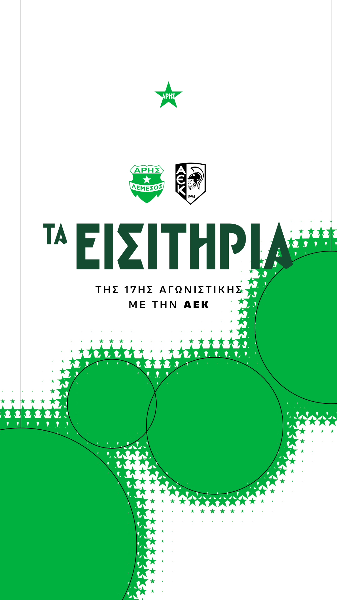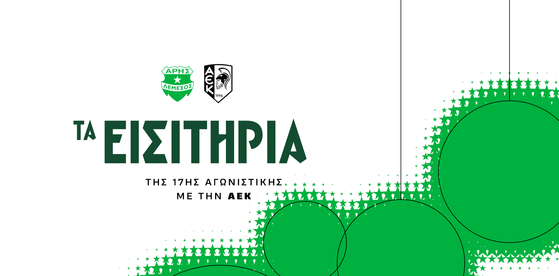 Τα εισιτήρια διατίθενται διαδικτυακά από την επίσημη ιστοσελίδα μας www.arisfc.com. Επίσης, από τα γραφεία της ομάδας μας στην Λεωφόρο Αμαθούντος 56, στον Άγιο Τύχωνα (απέναντι από το ξενοδοχείο POSEIDONIA), Τετάρτη με Παρασκευή από τις 09:30 έως τις 17:30 και το Σάββατο 10:00 με 13:00.