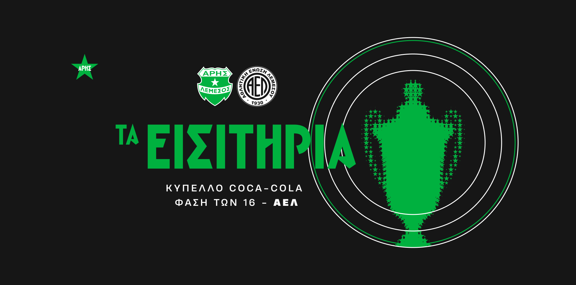 Τα εισιτήρια διατίθενται διαδικτυακά από την επίσημη ιστοσελίδα μας www.arisfc.com. Επίσης, από τα γραφεία της ομάδας μας στην Λεωφόρο Αμαθούντος 56, στον Άγιο Τύχωνα (απέναντι από το ξενοδοχείο POSEIDONIA), Δευτέρα και Τρίτη από τις 09:30 έως τις 17:30 και την Τετάρτη 09:30 με 13:00.
